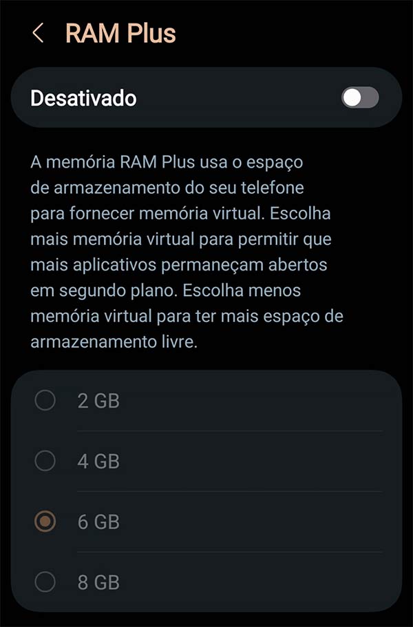 Embora o RAM Plus ajude a manter mais aplicativos na memória, ele consome uma pequena quantidade de CPU para compactar e descompactar dados. Se você deseja gerenciar esse recurso, pode desativá-lo ou ajustá-lo.