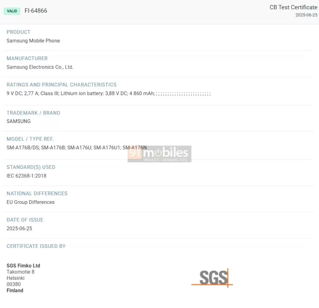 Informações recentes, provenientes da certificação SGS Fimko na Finlândia, revelam que o Galaxy A17 5G (identificado pelo número de modelo SM-A176B e suas variantes) virá equipado com uma bateria de 4.860 mAh (capacidade nominal), que será comercializada como 5.000 mAh. Embora a Samsung não esteja aumentando a capacidade da bateria em relação ao seu antecessor, o Galaxy A16 5G, o aparelho se destaca pela tecnologia de carregamento. Ele suportará carregamento de 25W, o que a Samsung denomina Carregamento Super Rápido (mas que na prática ainda falta um pouco para isso), um recurso que otimiza a experiência do usuário ao reduzir significativamente o tempo de recarga.